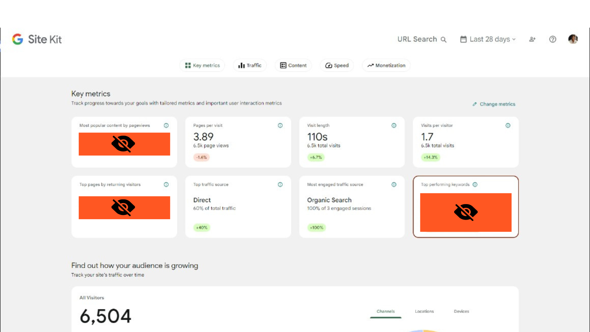 Pages per visit at nearly 3.8, 110-second sessions, a strong 1.7 repeat rate, and 6.5k views signal sustained intent from qualified users. A small visitor dip doesn’t substantially alter the strength of the underlying demand.