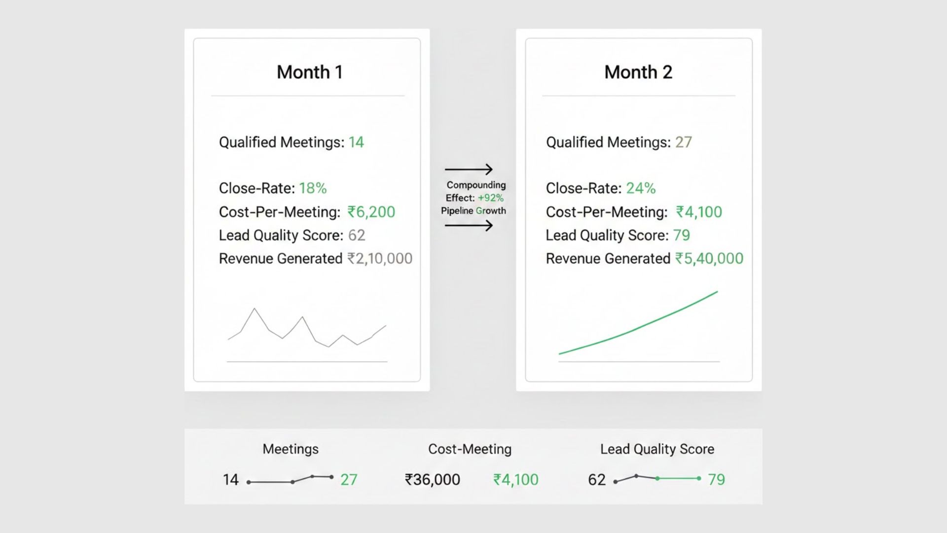 Month-over-month pipeline expansion: qualified meetings rising from 14 to 27, cost-per-meeting dropping from ₹6,200 to ₹4,100, and lead quality improving from 62 to 79. evidence of a system that compounds instead of leaking.